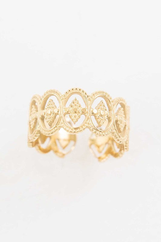 The Roma Adjustable Ring features frame oval outlines with textured diamond shapes.